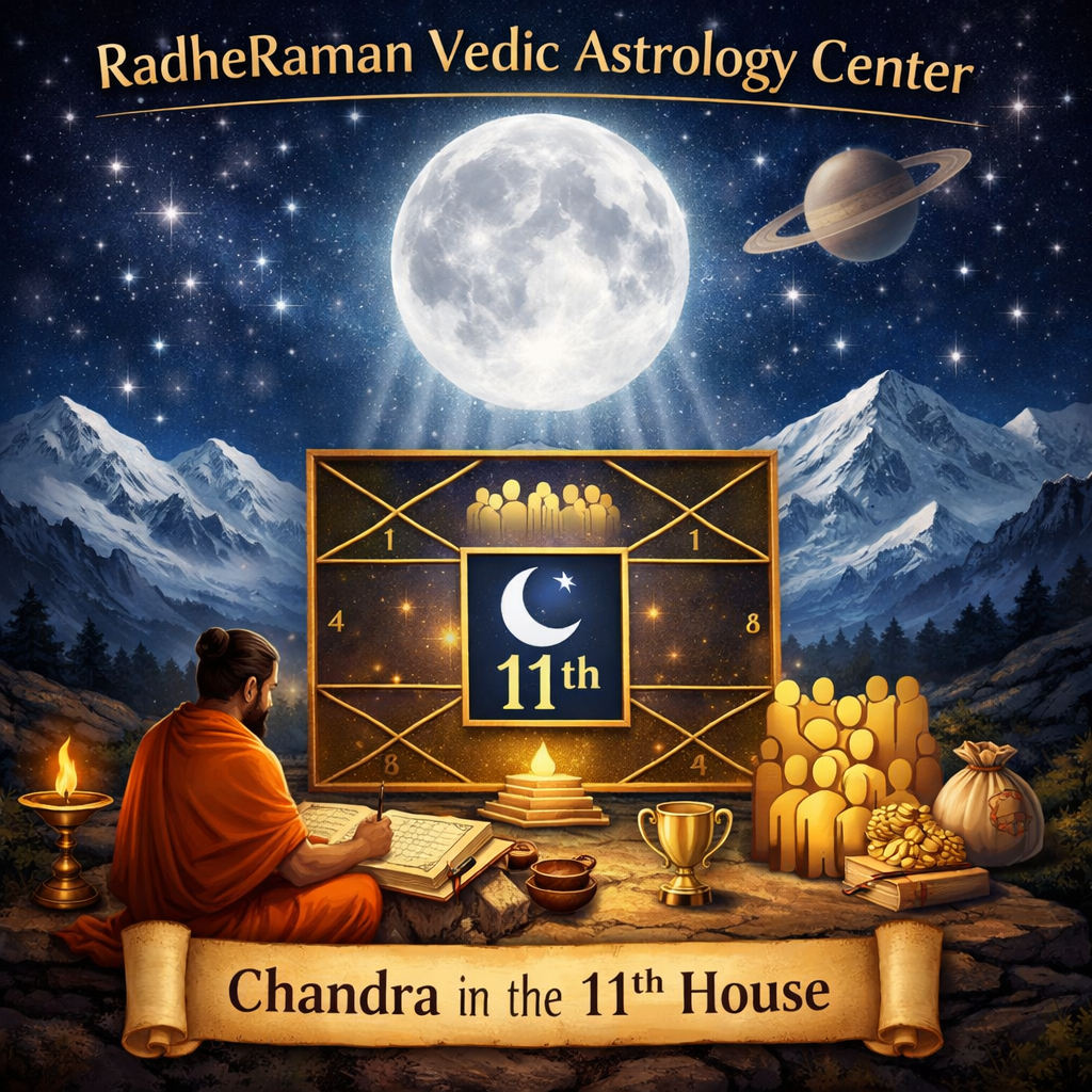Chandra (Moon) in 11th House in Vedic Astrology – Gains, Friendships and Success Discover the meaning of Moon in the 11th house in Vedic astrology. Learn how Chandra in the eleventh house influences gains, friendships, ambitions, and fulfillment of desires.