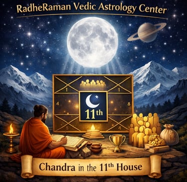 Discover the meaning of Moon in the 11th house in Vedic astrology. Learn how Chandra in the eleventh house influences gains, friendships, ambitions, and fulfillment of desires.