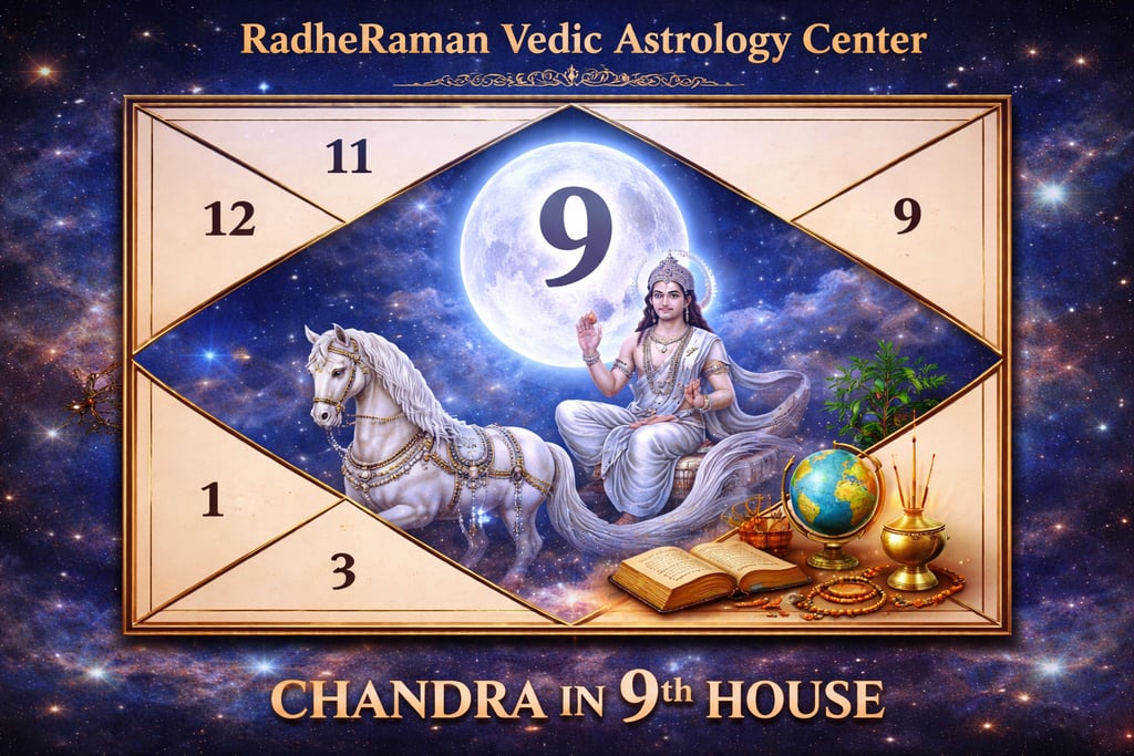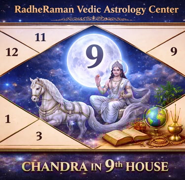 For Radheraman Vedic Astrology Center, the placement of the Moon in the ninth house is considered highly significant because it influences a person’s belief system, spiritual inclination, and overall life fortune.
