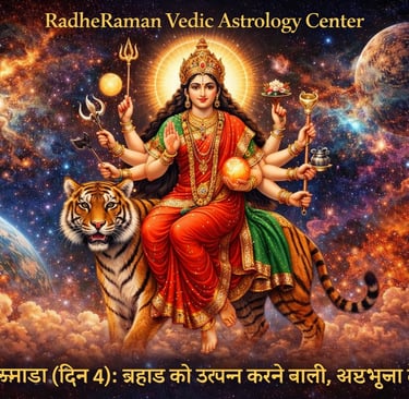 At RadheRaman Vedic Astrology Center, devotees are encouraged to worship Maa Kushmanda with devotion and purity during Navratri. Her blessings help create harmony, prosperity, and divine protection in life.