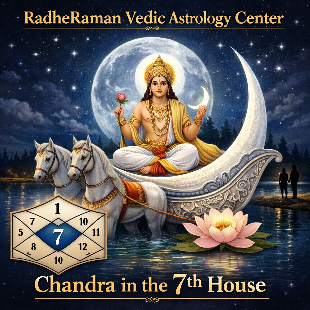 When Chandra is placed in the 7th house of the birth chart, it has a strong influence on marriage, partnerships, public relationships, and social reputation. The 7th house in astrology is known as the house of spouse, marital life, long-term partnerships, and business collaborations. Because the Moon is a highly emotional and changeable planet, its presence in this house often makes relationships a central theme in the native’s life.