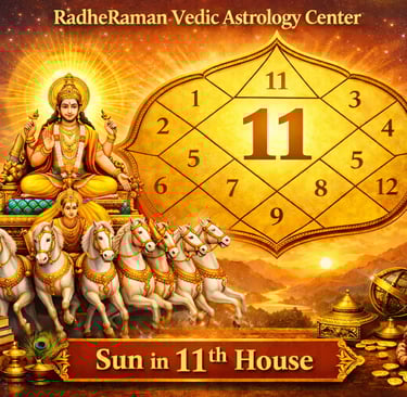 At RadheRaman Vedic Astrology Center, the Sun in the 11th house is considered a favorable placement because it helps the native achieve goals, build influential networks, and receive respect within social and professional circles.