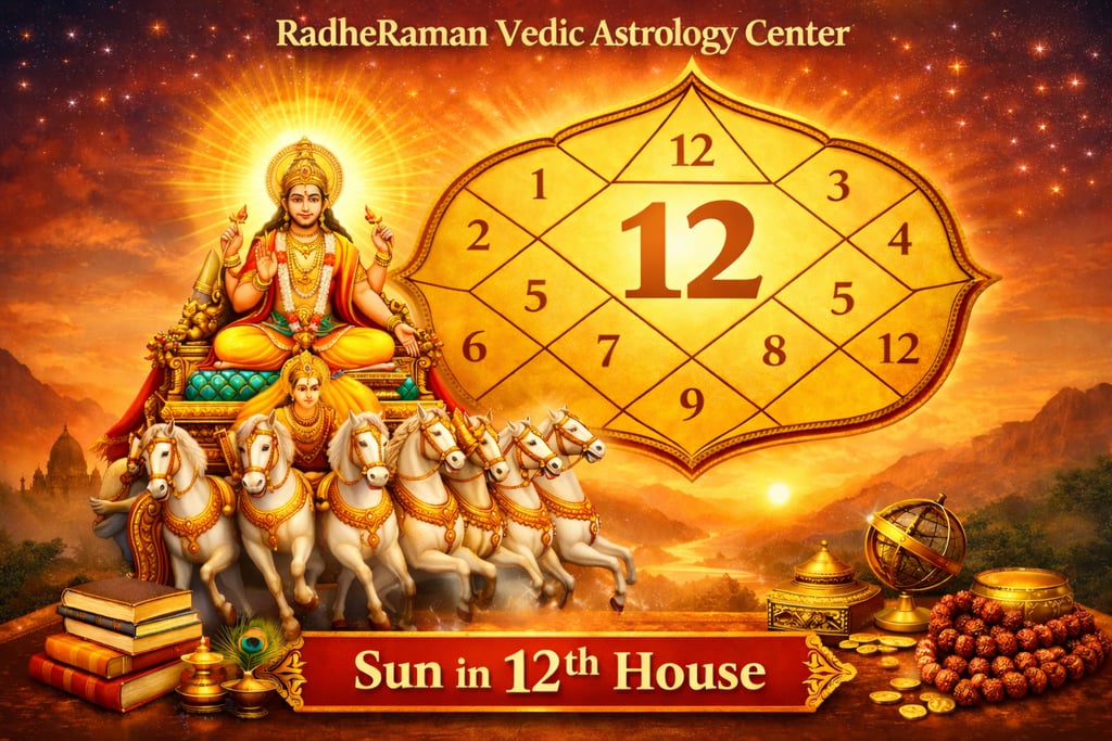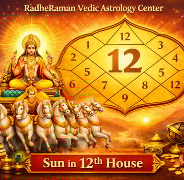 At RadheRaman Vedic Astrology Center, the Sun in the 12th house is seen as a placement that encourages the native to explore deeper aspects of life, including spirituality, self-discovery, and service to others.